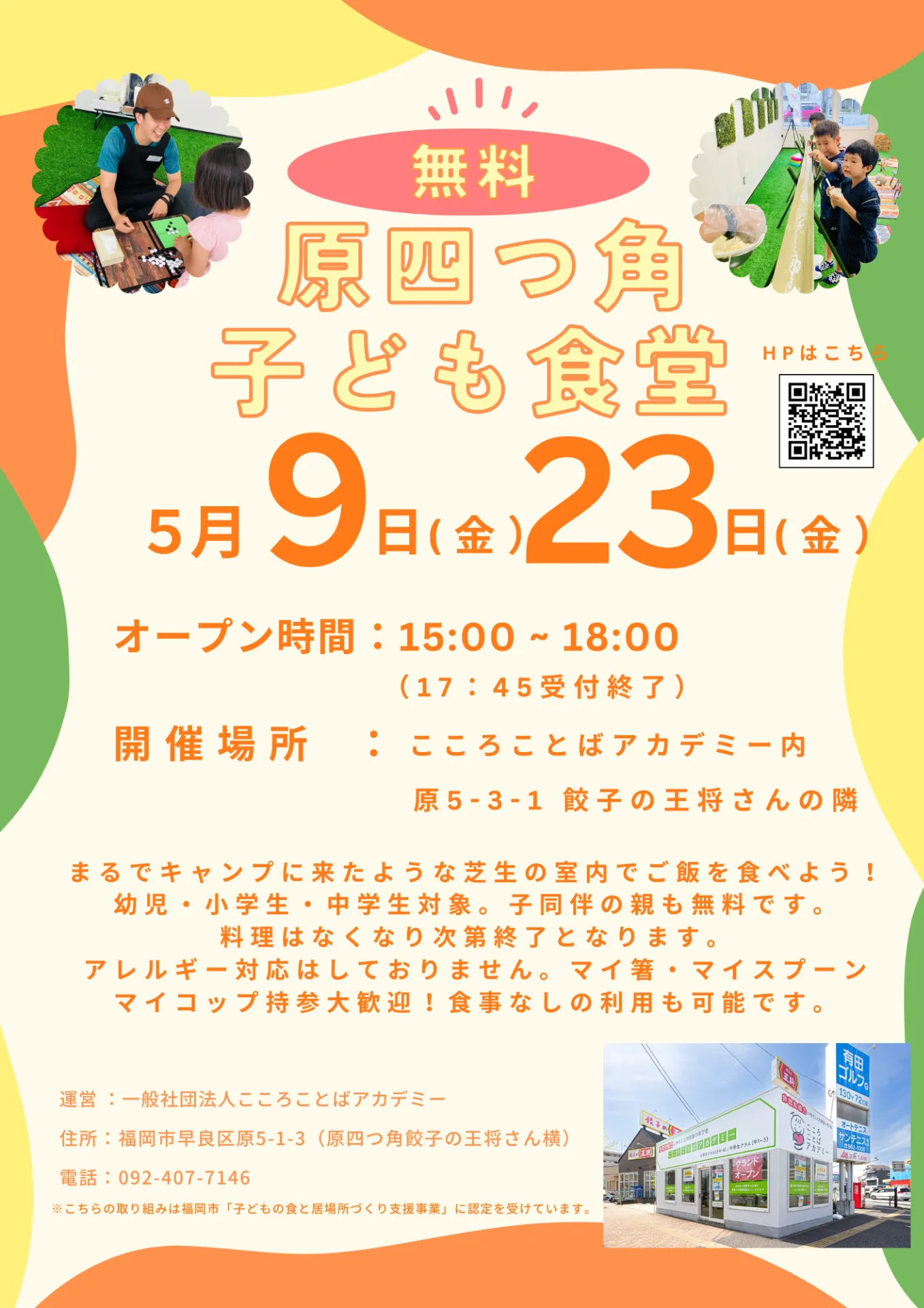 5月9日(金)5月23日(金)15:00 - 18:00にて「原四つ角子ども食堂」を実施します🌈