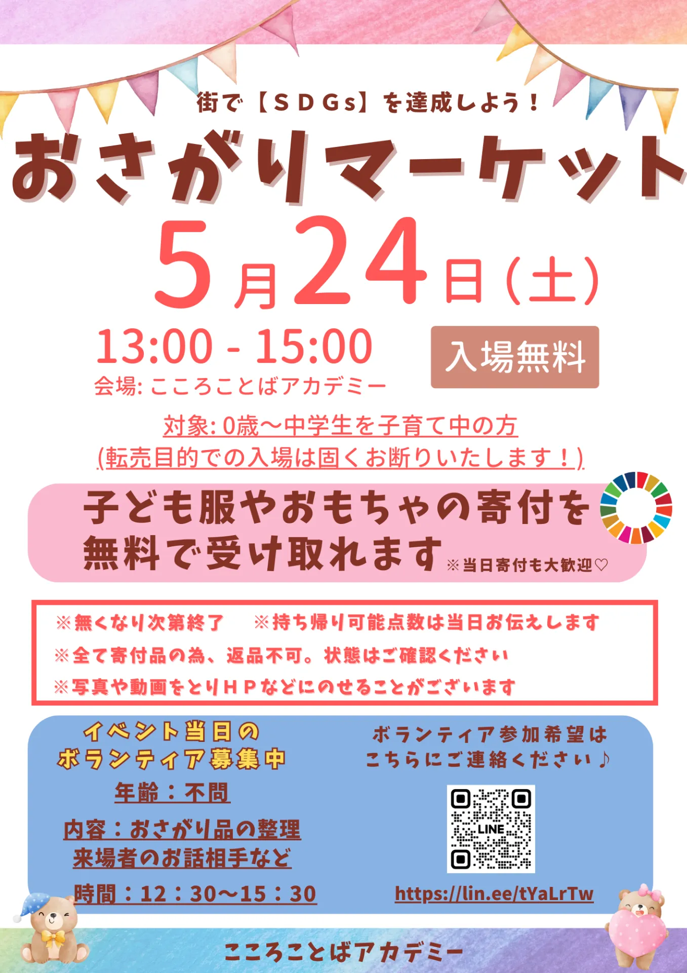 ★おさがりマーケット★inアカデミー ■5/24(土) イベント時間:13:00-15:00予定 ボランティア時間:12:30-15:30予定 来場者の対応や声掛け、洋服の整理など 内容:使わなくなった子ども服やおもちゃを次の人に無料で繋ごうというイベント。 ボランティア内容:来場者の見守り、洋服やおもちゃの整理、片付けなど 持ち物:エプロン