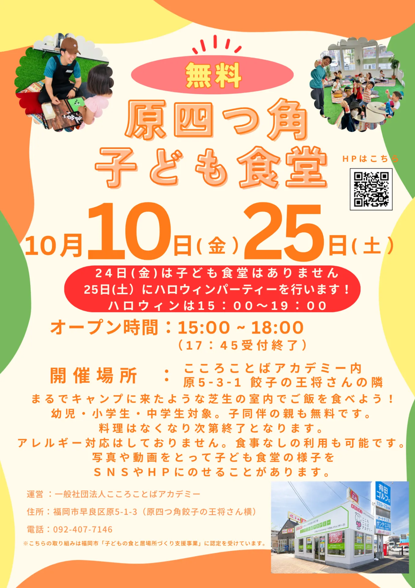 10月10日(金)15:00 - 18:00 10月25日(土)ハロウィンパーティー15:00-19:00にて「原四つ角子ども食堂」を実施します🌈